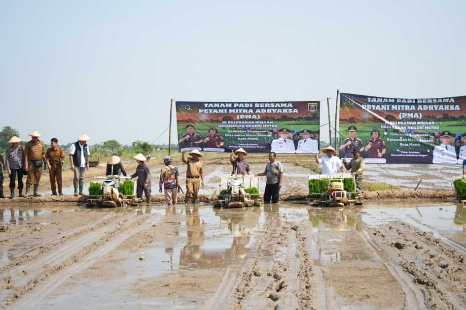 Pepadun.com, Metro – Pemerintah Kota Metro bersama jajaran Kejaksaan Tinggi (Kejati) Lampung melaksanakan kegiatan Tanam Padi Petani Mitra Adhyaksa (PMA) di Kelurahan Sumbersari, Kecamatan Metro Selatan, Selasa (04/11/2025).